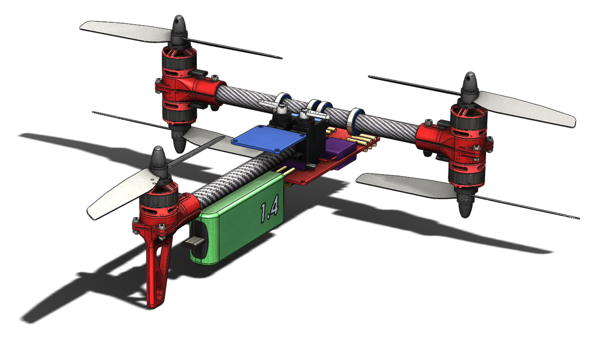 The next step is going to be having another look at the battery placement and power distribution. I am not happy with the positioning of the bullet connectors for the motors with respect to the arms and the battery connector and wiring is not going to work as shown here.