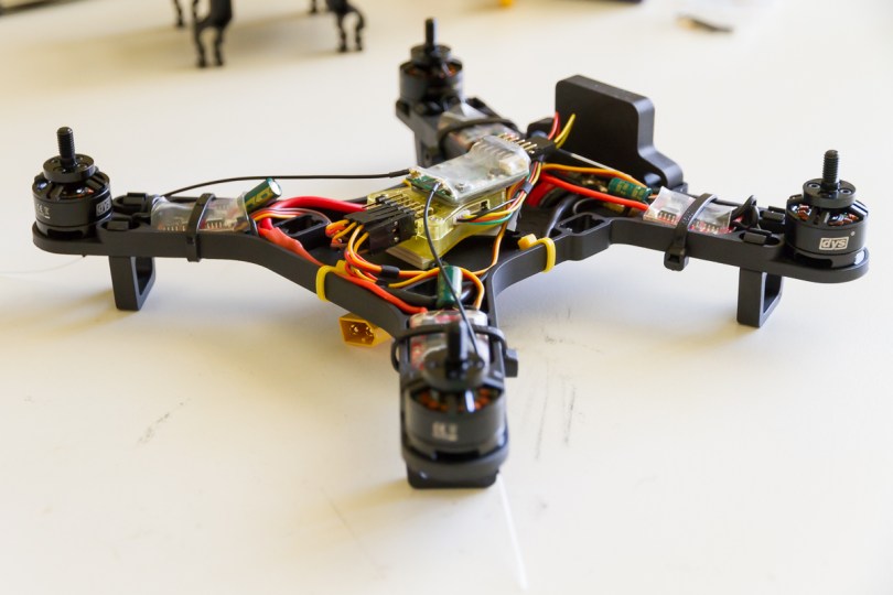 The wires from the rear motors meet the battery wires and front motors at this small power distribution board made from a piece of strip board. The copper strips aren’t really carrying much of the power it simply provides an easy foundation onto which each wire can be joined. Also hinted at in the photo above is the fact that I have routed the battery wires through the base plate. This seemed the only tidy way I could route them whilst providing enough tension that the battery leads be pulled out of range of the propellers.
