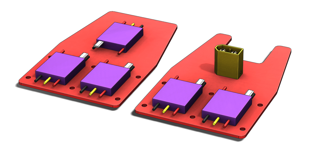 The power distribution philosophy has also seen some development. Primarily I have split the ESCs onto separate top and bottom boards. These boards will also serve as sandwich plates on the outsides of the internal structure (supporting bearings, servos etc.). I’ve also decided to forgo the use of board mounted bullet connectors and instead solder the motor wires either directly to the ESCs or onto the power distribution boards. I learnt from the construction of the Spidex 220 that this is really not as much of a complication as I had imagined it might be. The extra board real estate also opens up a good spot for the XT60 connector, the battery wire would loop around and in on itself to connect.