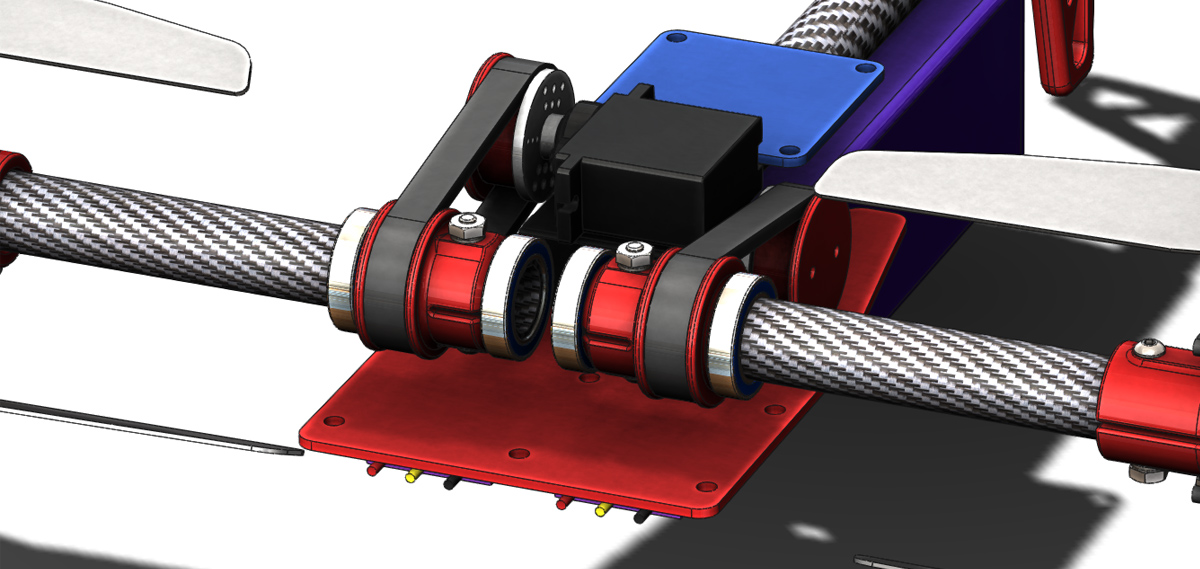 After looking at the range of motion that was going to be achievable with the previously shown boom control arms I was dissatisfied. Only about 70° was realistic. As a rough goal I would like to achieve 135° (90° forward and 45° backward). To get this range of motion and maintain a compact envelope I have decided to investigate the use of a belt drive system. Shown below is the layout I have come up with. The servos are laid on their side and stacked on top of each other and custom pulleys are used at both ends. It may be possible to source a pulley to fit the servo directly but at this stage I have not come across a source so I intend to pursue a 3D printed pulley attached to a standard round horn.