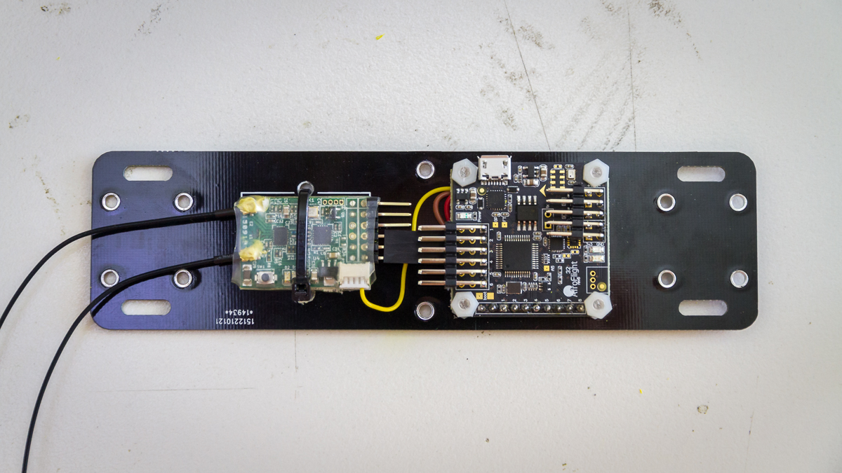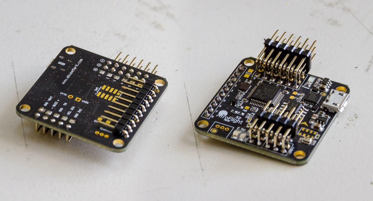 - Use the nylon fasteners to attach the flight controller to the appropriately marked PCB. Each screw comes through from the outside and is secured to the plate with a nut. The Naze32 is then stacked on top and secured with another screw. Prior to attaching it to the PCB install pins on the Naze32 rev 6 as follows: