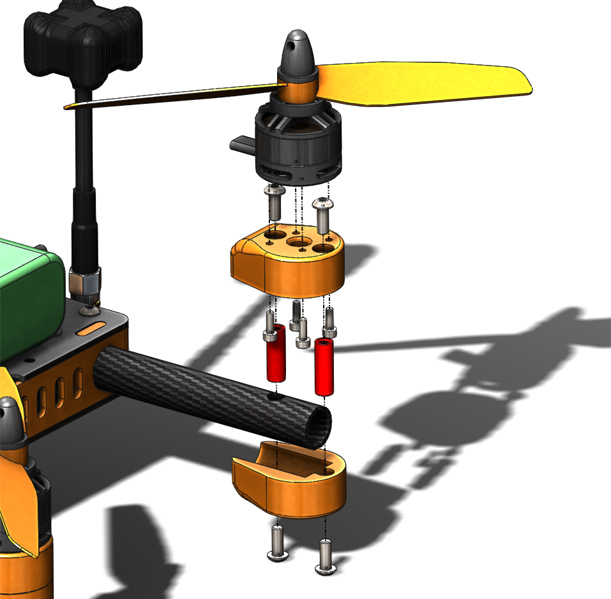 As seen in this exploded view of the motor mount the tubes are now drilled with a 5mm hole to accept the same 15mm M3 standoff that is used throughout the rest of the frame build. The 2 printed parts of the motor mounts then snap over these standoffs and are clamped together with M3x8 button head screws. The only trick to this is that the standoffs must be screwed in to the top half of the mount before the motor is subsequently mounted to that before it is finally installed on the arm.