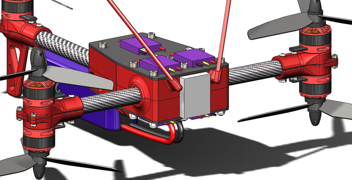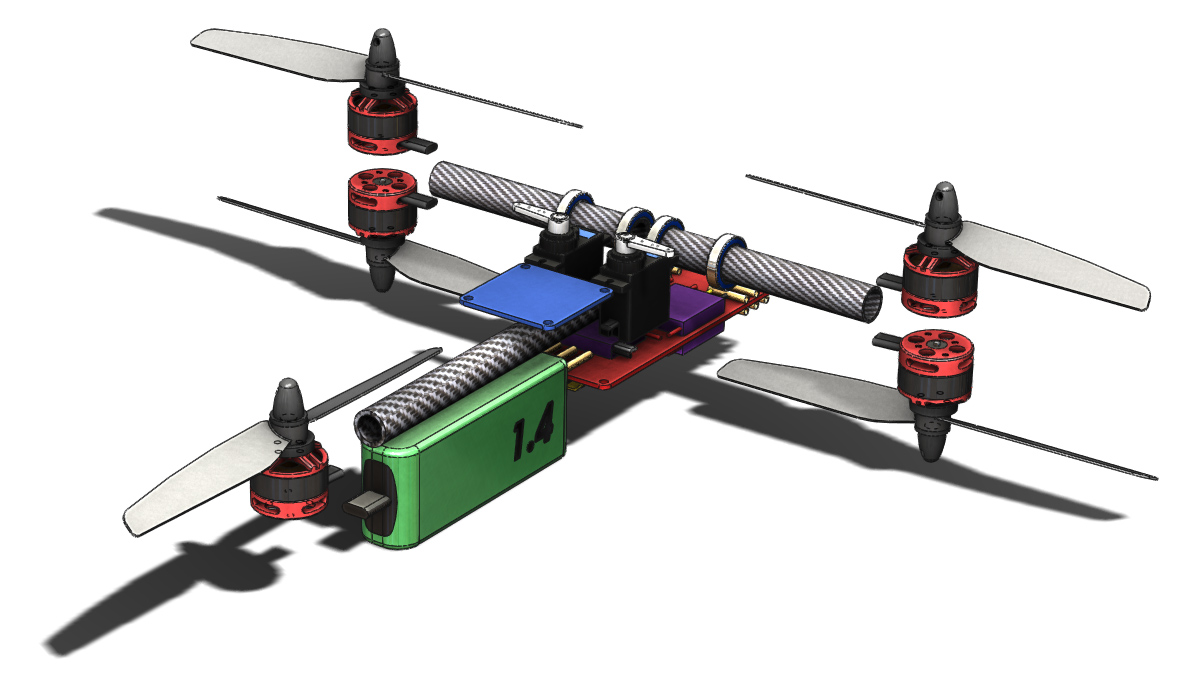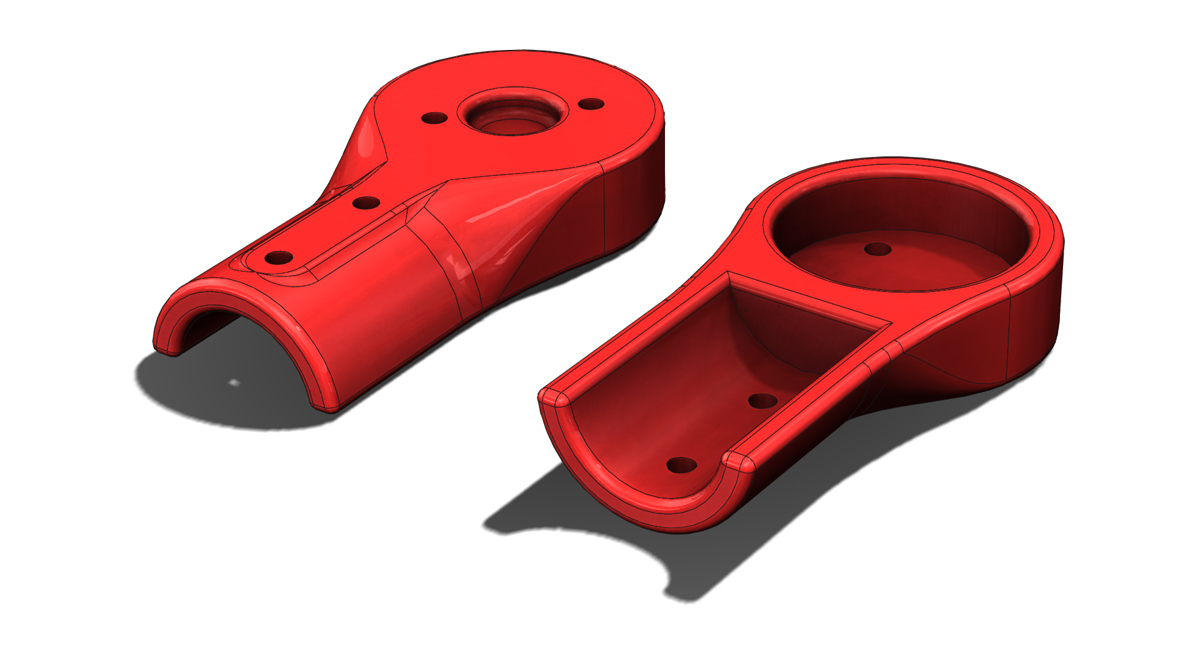 This is how the lower chassis piece appears in isolation. There is still plenty of refinement to follow including weight reduction (only where significant gains can be made given that this is primarily a proof of concept) and rounding of sharp corners. The upper half is a direct copy of this piece for the bearing supports and servo mounting but the rear end changes to make space for the flight controller.
