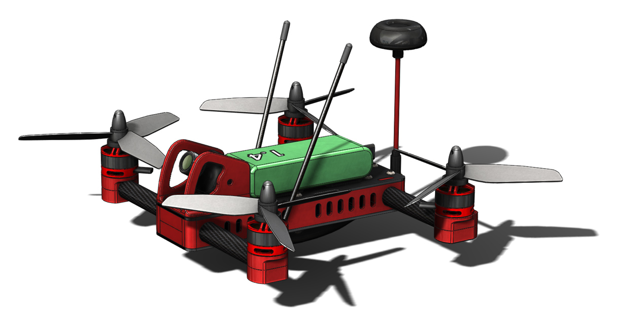 1. 3D printed holes for fasteners should be drilled out to their finished size after printing. This includes the 5mm holes for the frame standoffs (parts 103, 108 and 111) and the 2mm holes in the motor mounts (parts 104 and 105).