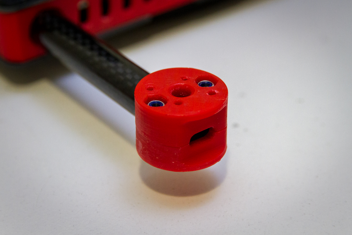 As seen in this exploded view of the motor mount the tubes are now drilled with a 5mm hole to accept the same 15mm M3 standoff that is used throughout the rest of the frame build. The 2 printed parts of the motor mounts then snap over these standoffs and are clamped together with M3x8 button head screws. The only trick to this is that the standoffs must be screwed in to the top half of the mount before the motor is subsequently mounted to that before it is finally installed on the arm.